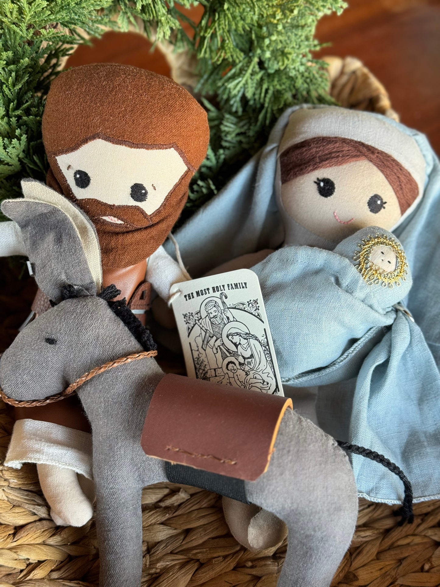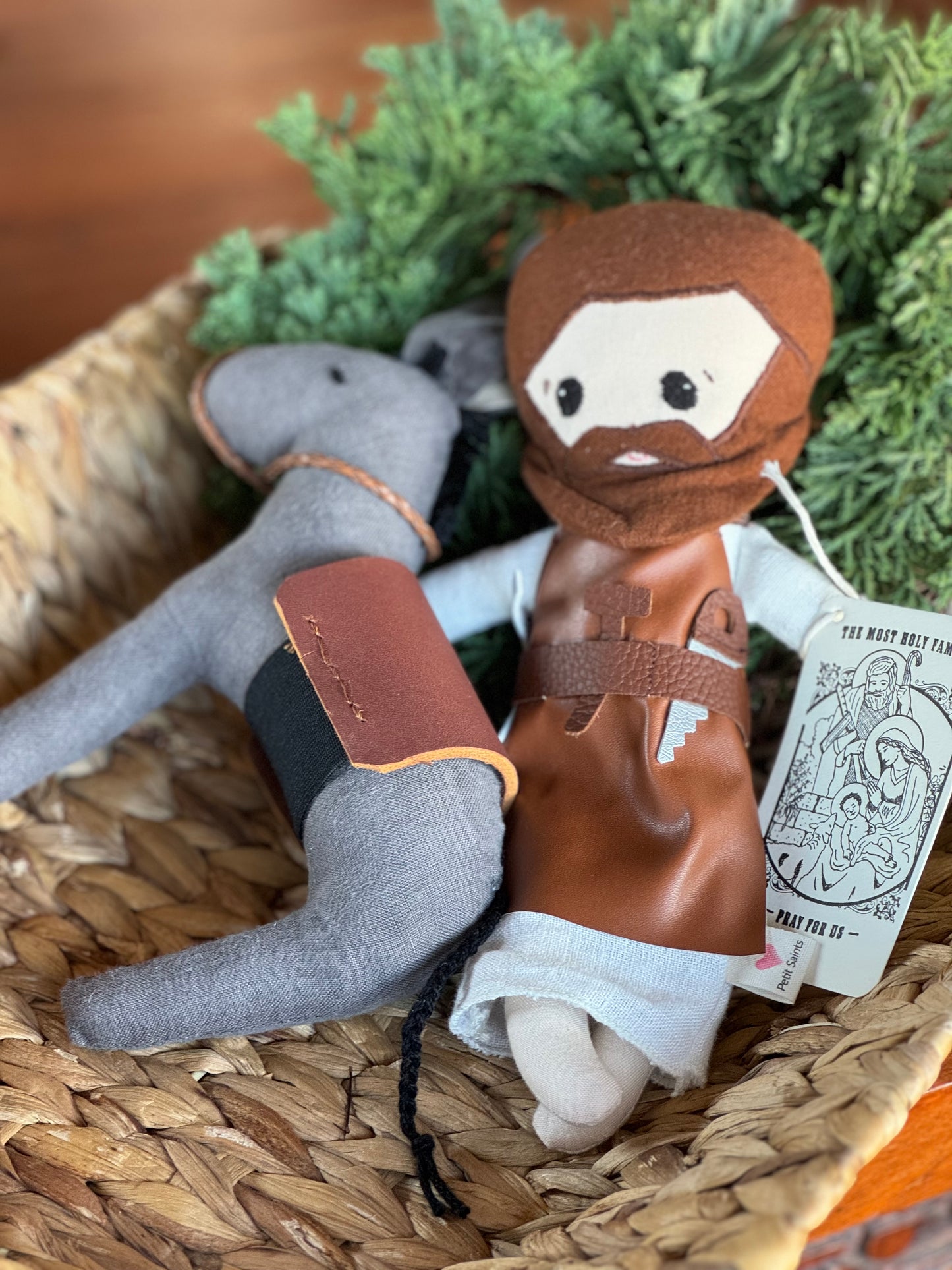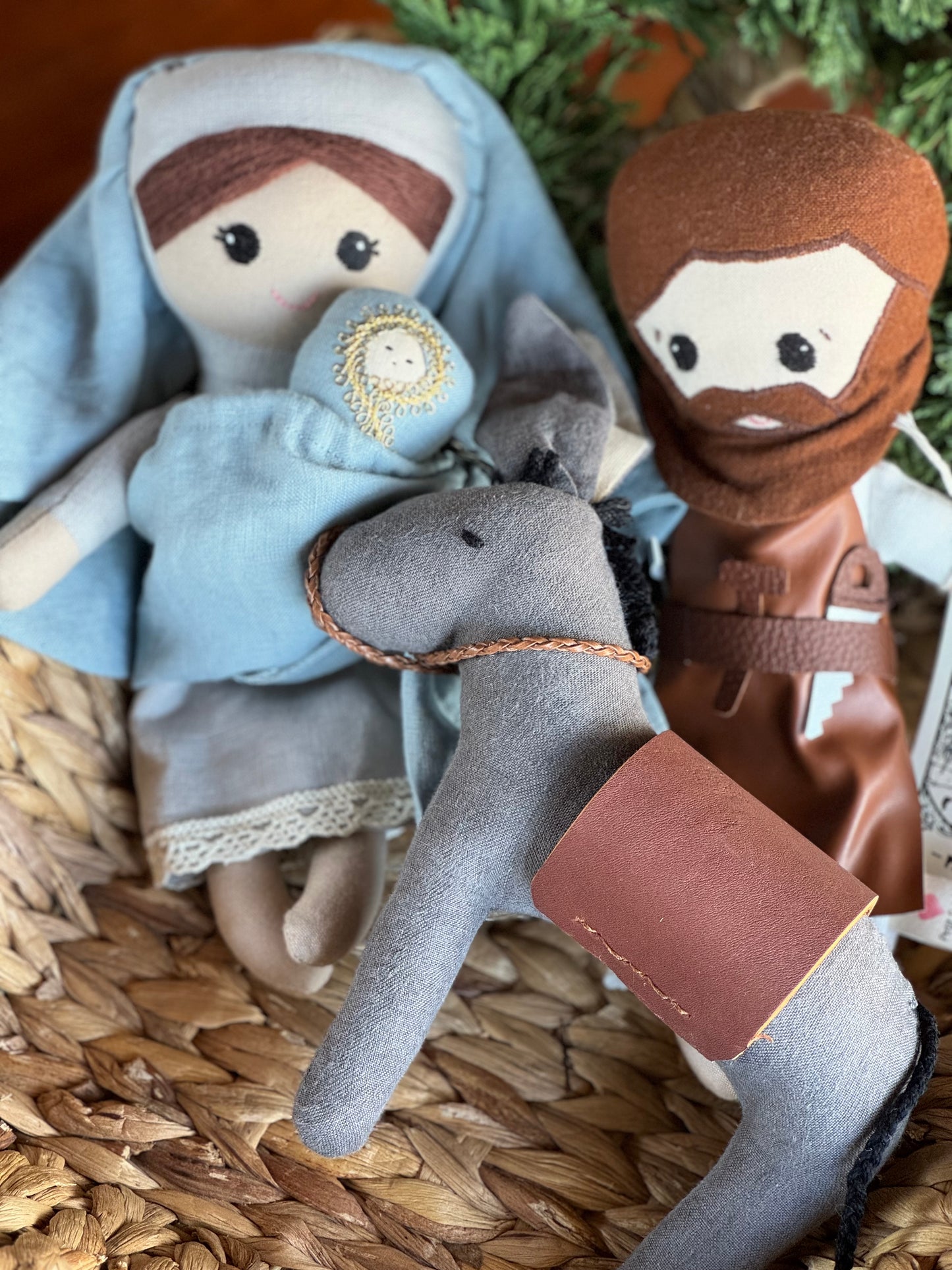 This hand-crafted Holy Family set features a donkey with a real leather saddle. The set includes a small linen bag held by Mary, which can also be used as a ring sling for Baby Jesus. St. Joseph is depicted wearing a faux leather work apron with sewn-on tools, making it perfect for inspiring imaginative and faith-filled play in children.