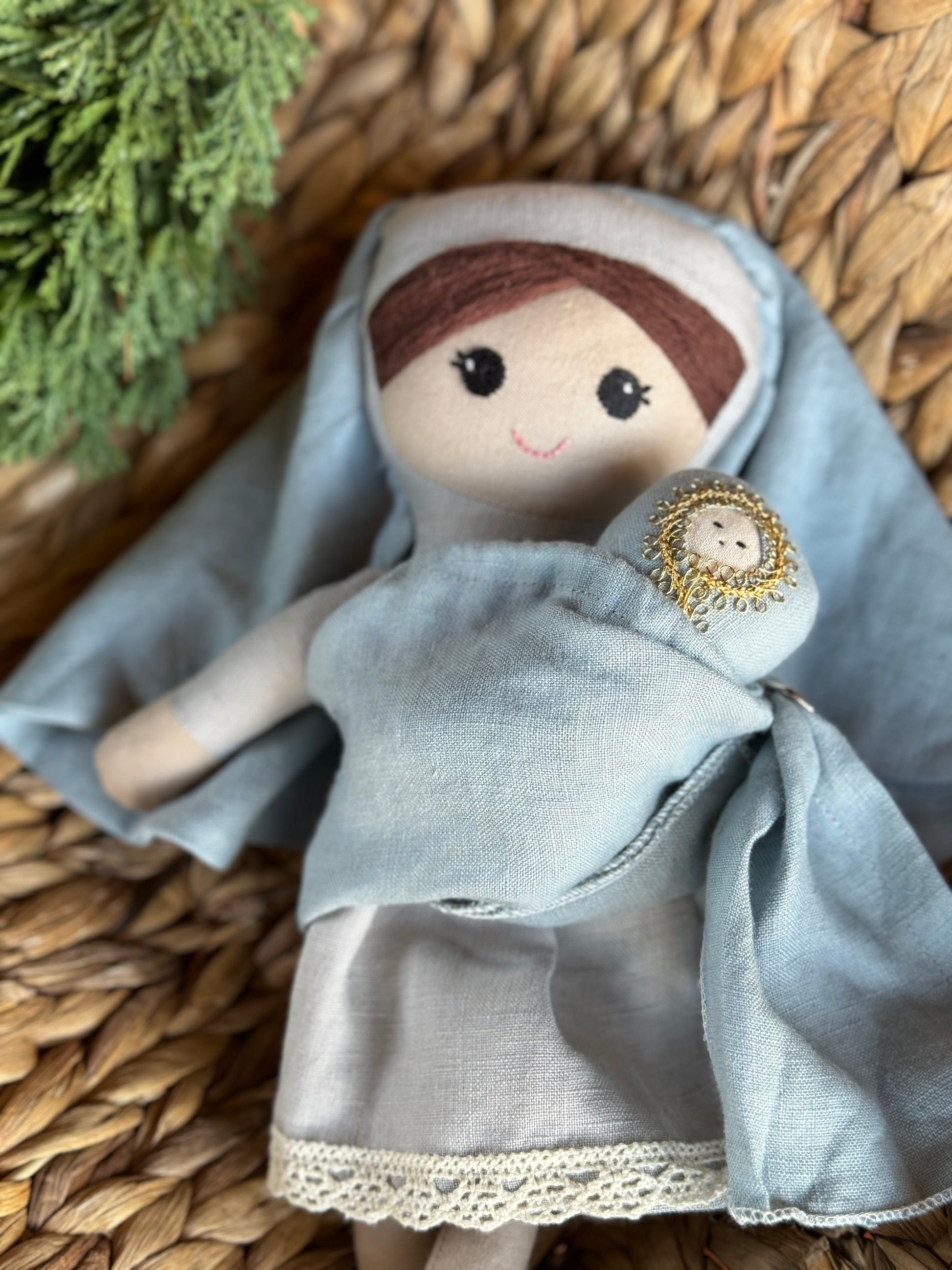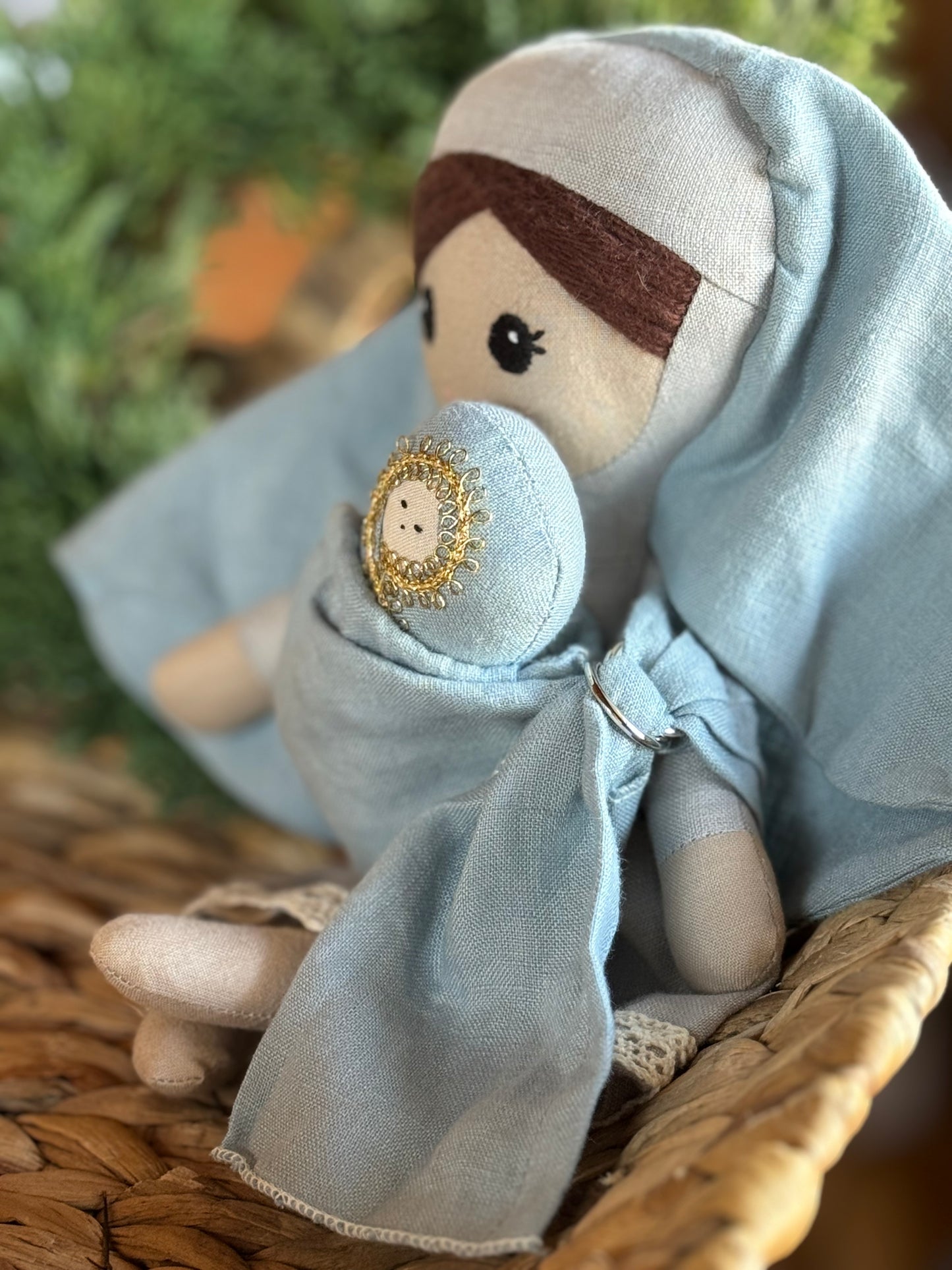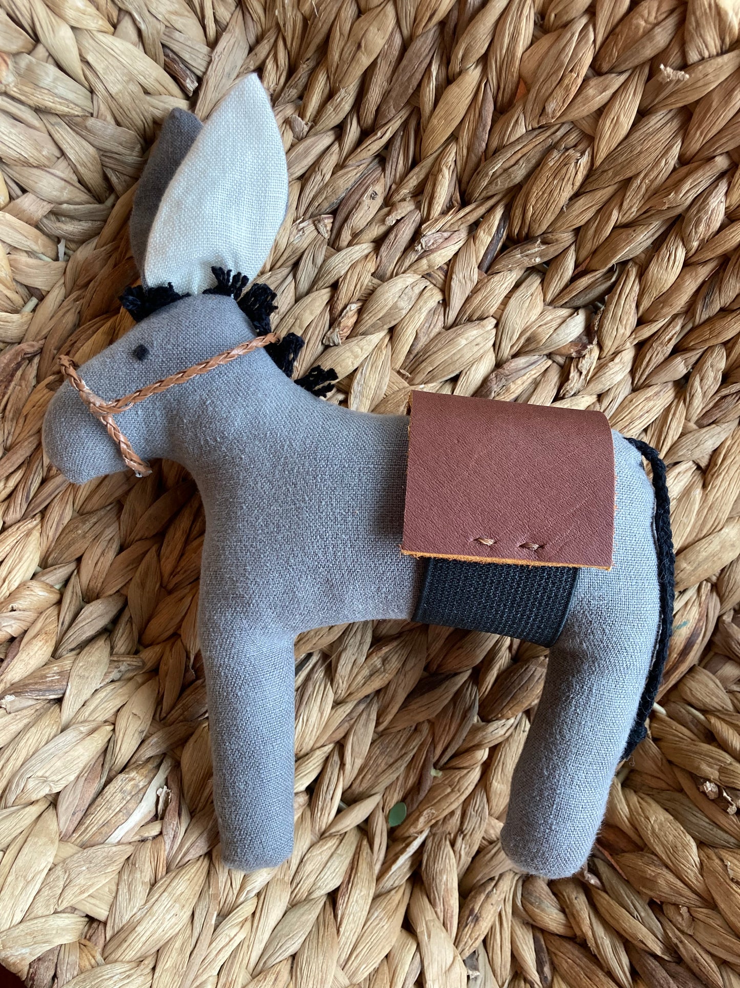 This hand-crafted Holy Family set features a donkey with a real leather saddle. The set includes a small linen bag held by Mary, which can also be used as a ring sling for Baby Jesus. St. Joseph is depicted wearing a faux leather work apron with sewn-on tools, making it perfect for inspiring imaginative and faith-filled play in children.