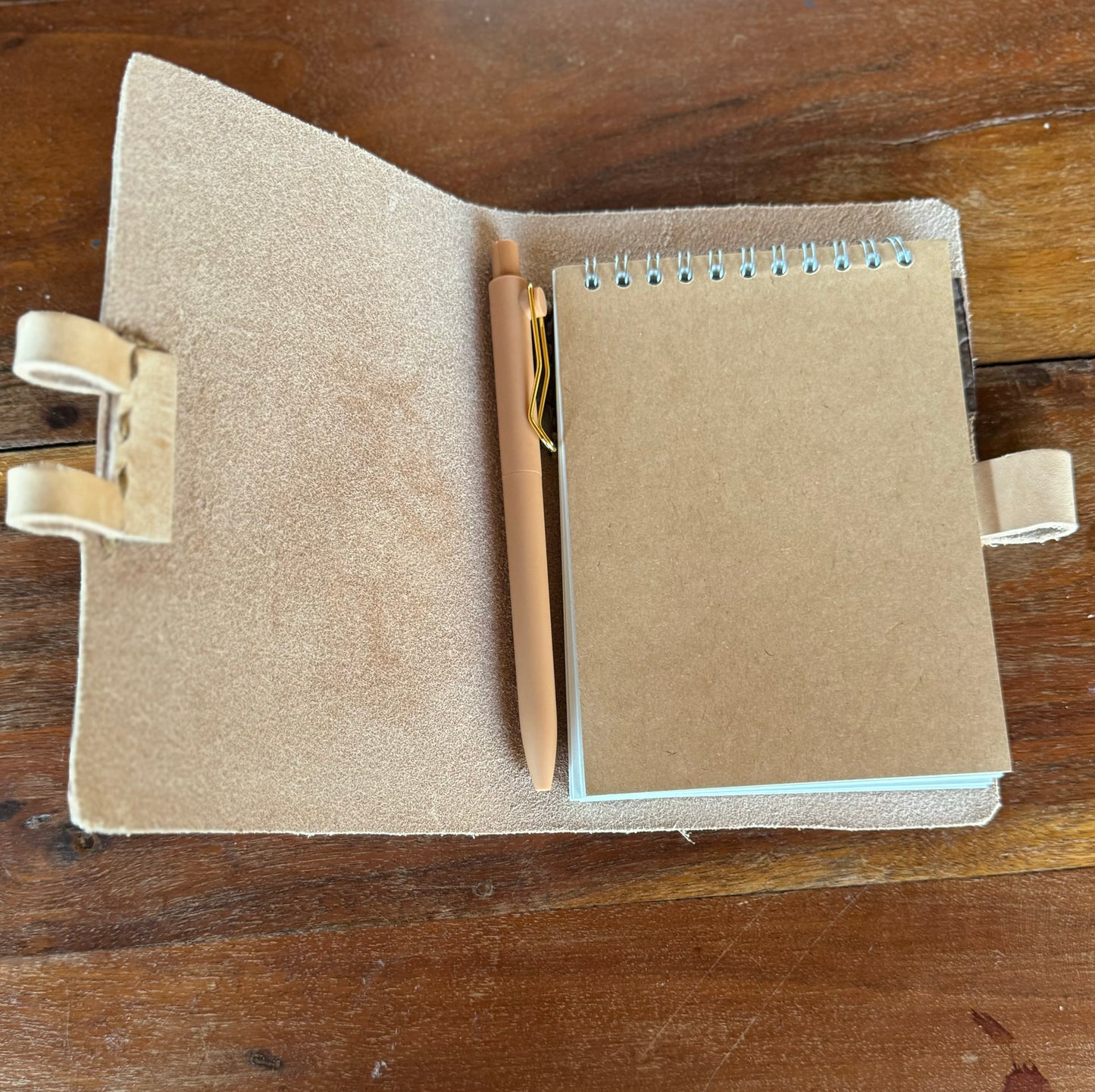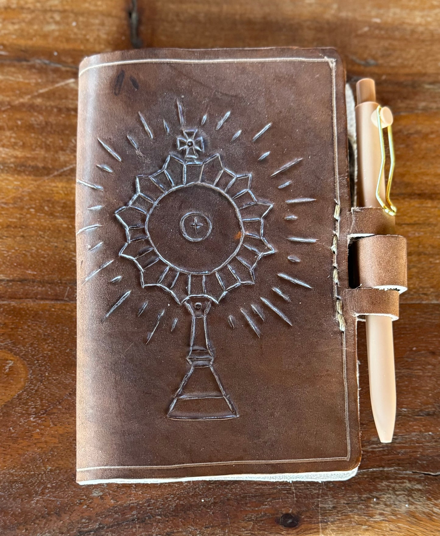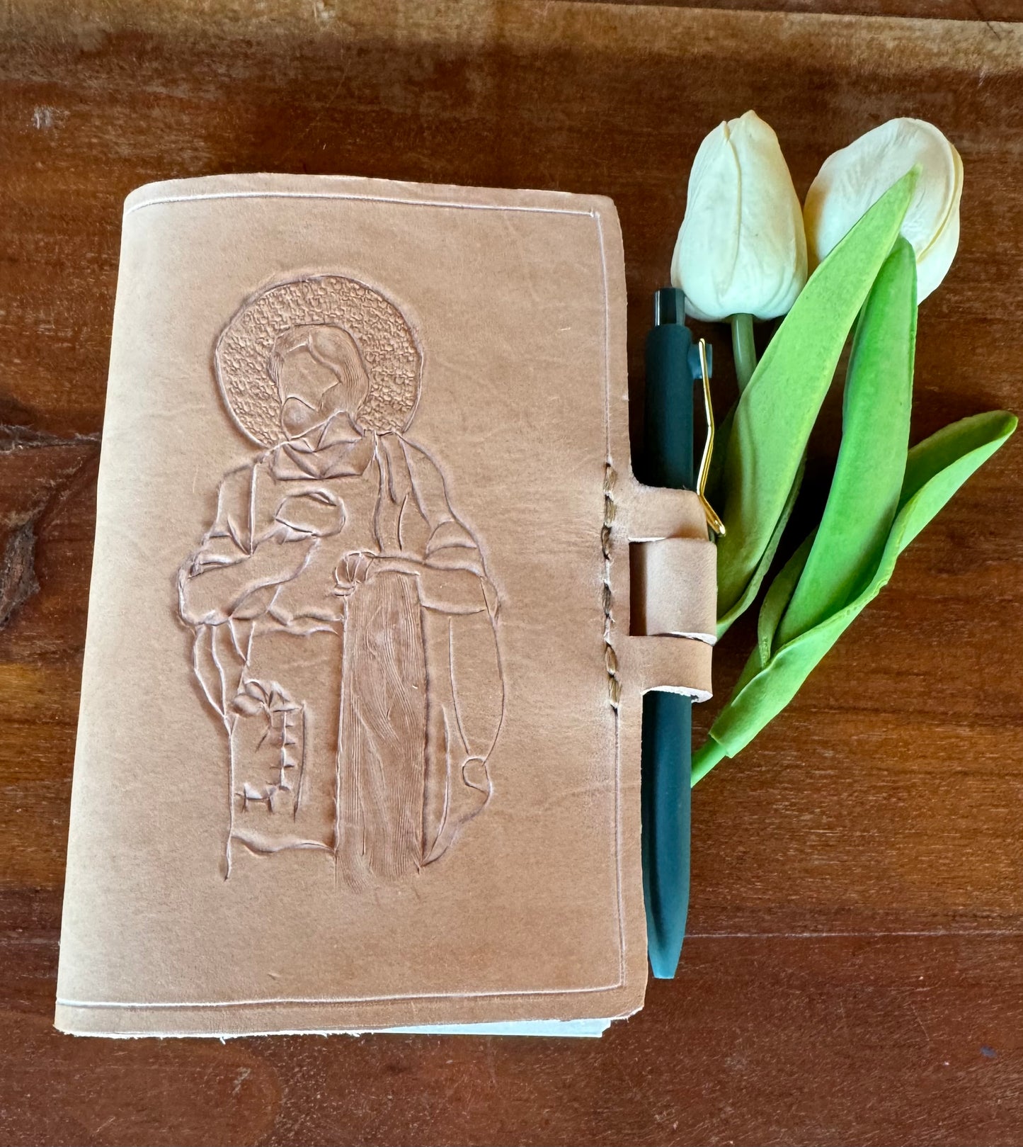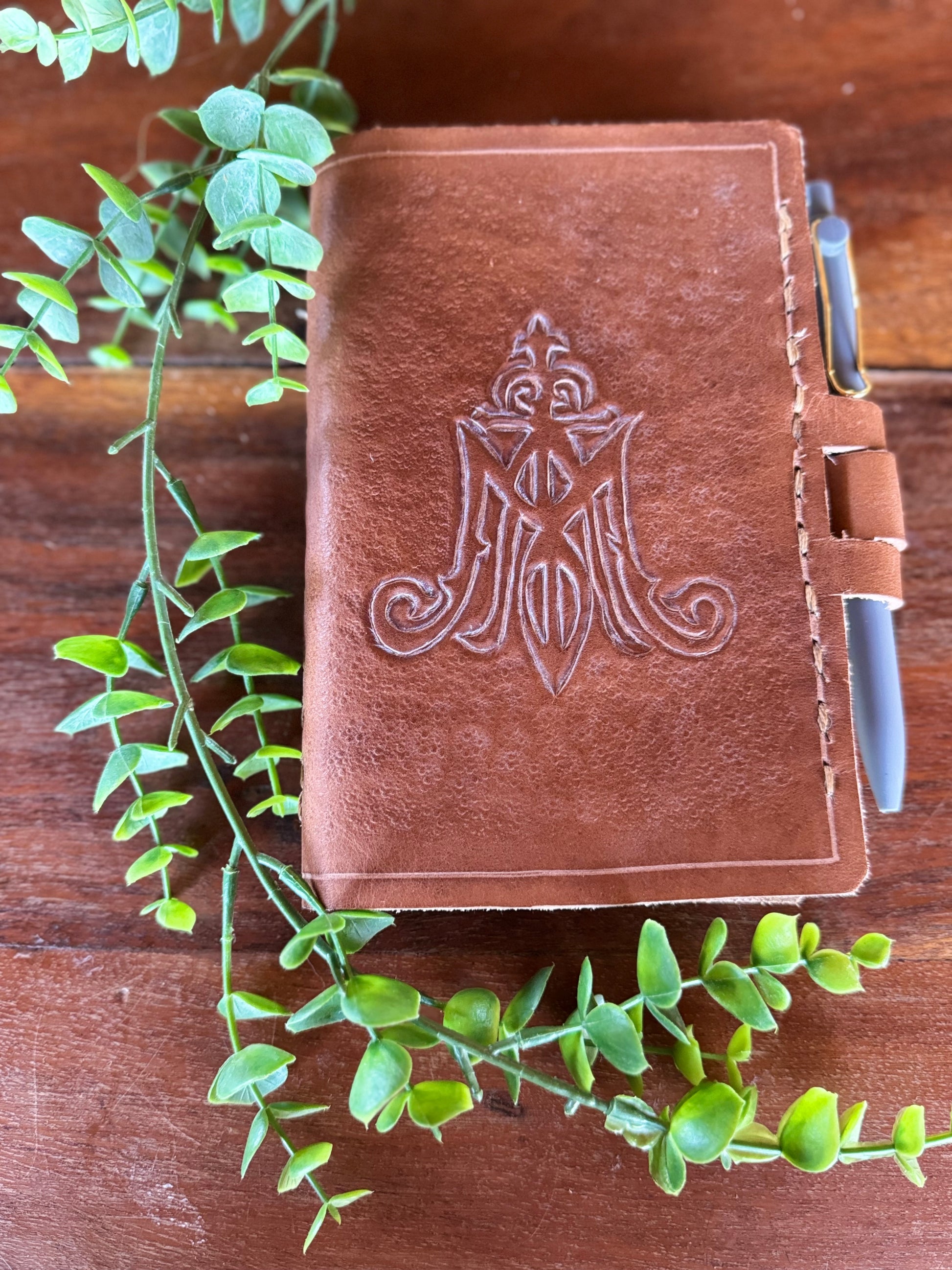 These notebooks, made by Marcel (10), feature an original hand-tooled religious design, making them unique and eye-catching. Made from leather, they offer a sophisticated touch and are refillable for endless use. Includes a pen for writing on the go. Enhance your writing experience with these beautiful notebooks.